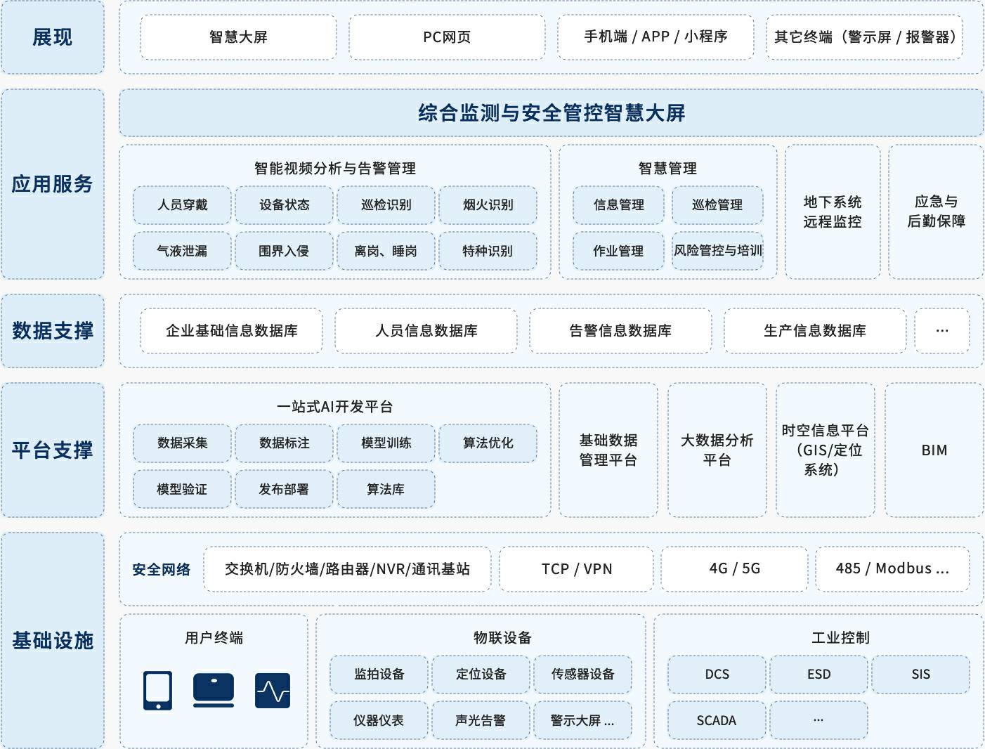 针对矿山安全生产的管理要求,紧抓需求痛点,首页| 尊龙集团中国官方网站创新提出“一基础、双支撑、多平台、N应用”的智慧矿山方案,实现不同阶段需求逐步实现未来智慧矿山。首页| 尊龙集团中国官方网站创新充分利用人工智能算法优势,从智能视频分析风险隐患切入,实现风险隐患全生命周期分析与管理,同时应用智慧化作业流程、智慧检维修提升作业生产效率,应急与后勤保障是重中之重,除了实现地下通风系统、定位系统、电力系统、通讯系统、排水系统以及环境监测系统的全天候监控之外,应急物资管理系统保障物资及时可用,人员设备定位系统保障下井人员位置的实时管控,充分实现应急后勤保障,首页| 尊龙集团中国官方网站创新智慧矿山方案永远将安全生产放在第一位。