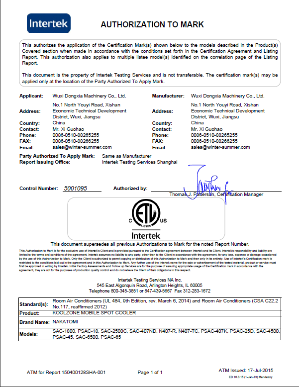 4001百老汇会员登入-百老汇官方网站近日宣布公司移动式工业冷气机获得的质量与安全第三方机构天祥实验室(世界上规模的消费品测试、检验和认证公司之一)颁发的ETL认证。